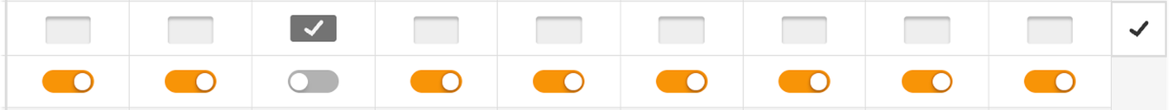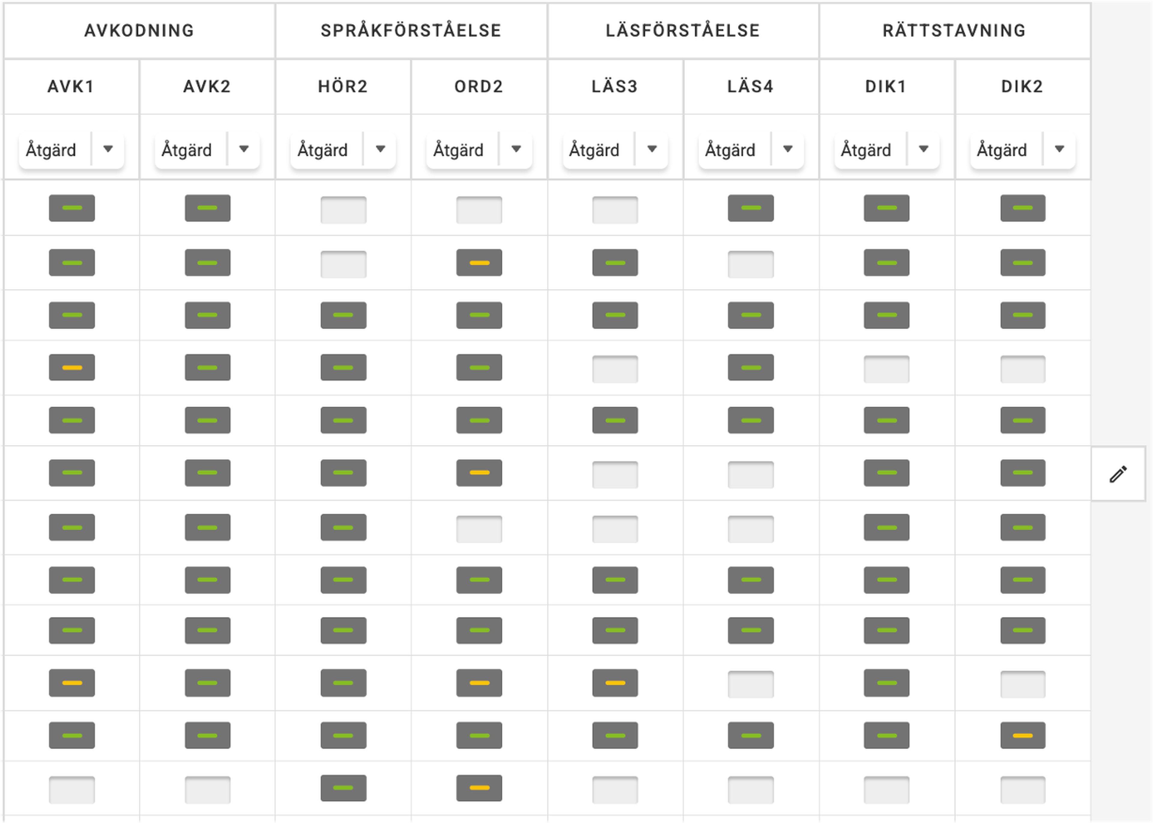 På mellanstadiet stänger vi av tester automatiskt av två anledningar: När eleverna uppvisat tillräckliga resultat stängs de av resten av läsåret och illustreras då med ett grönt eller gult streck. Vissa tester kan även stängas av om de är för svåra stänger och det illustreras då av ett kryss (avstängt pga för svårt).