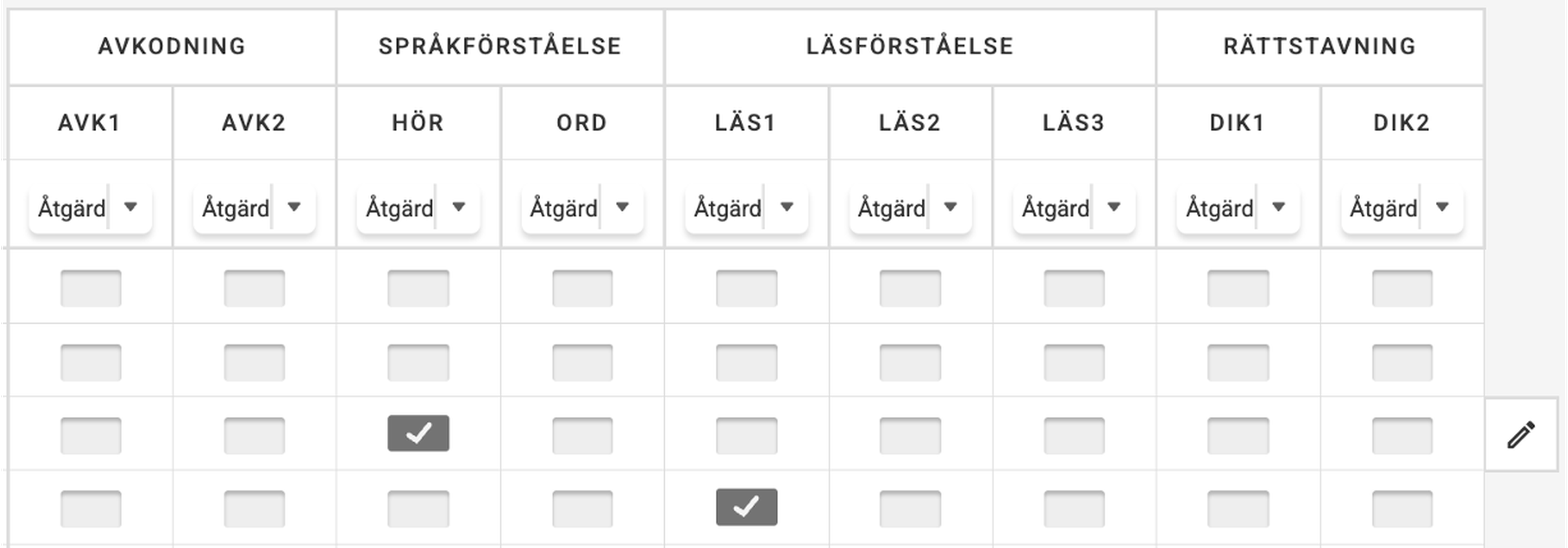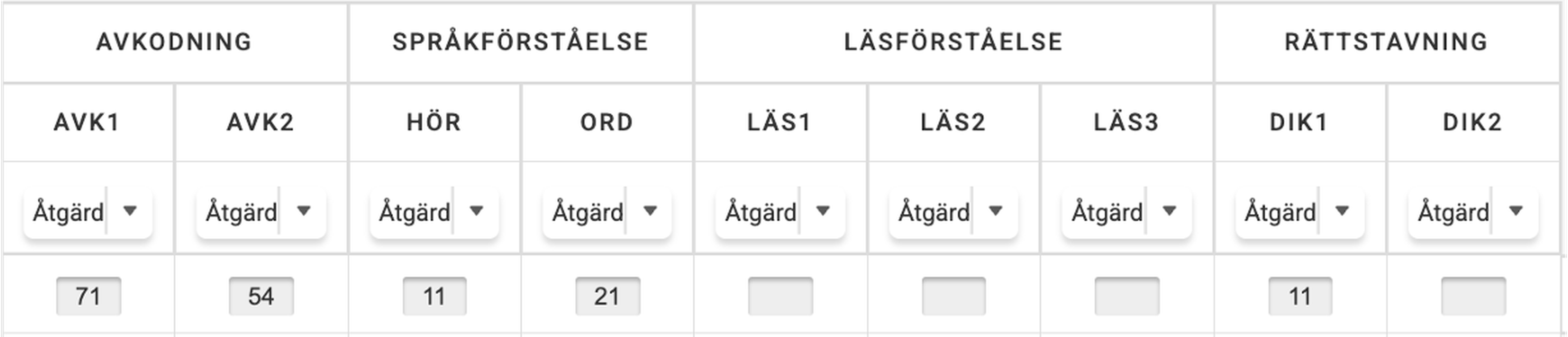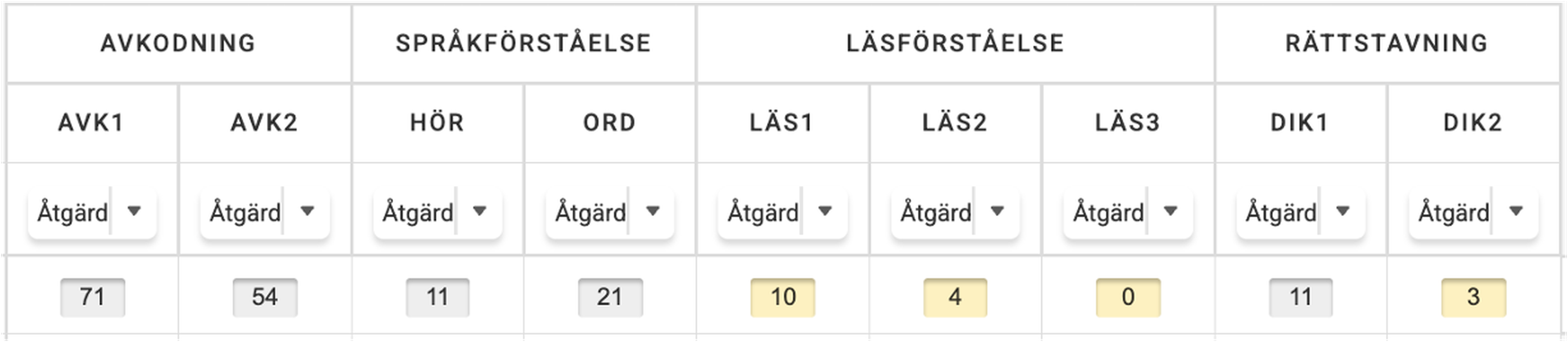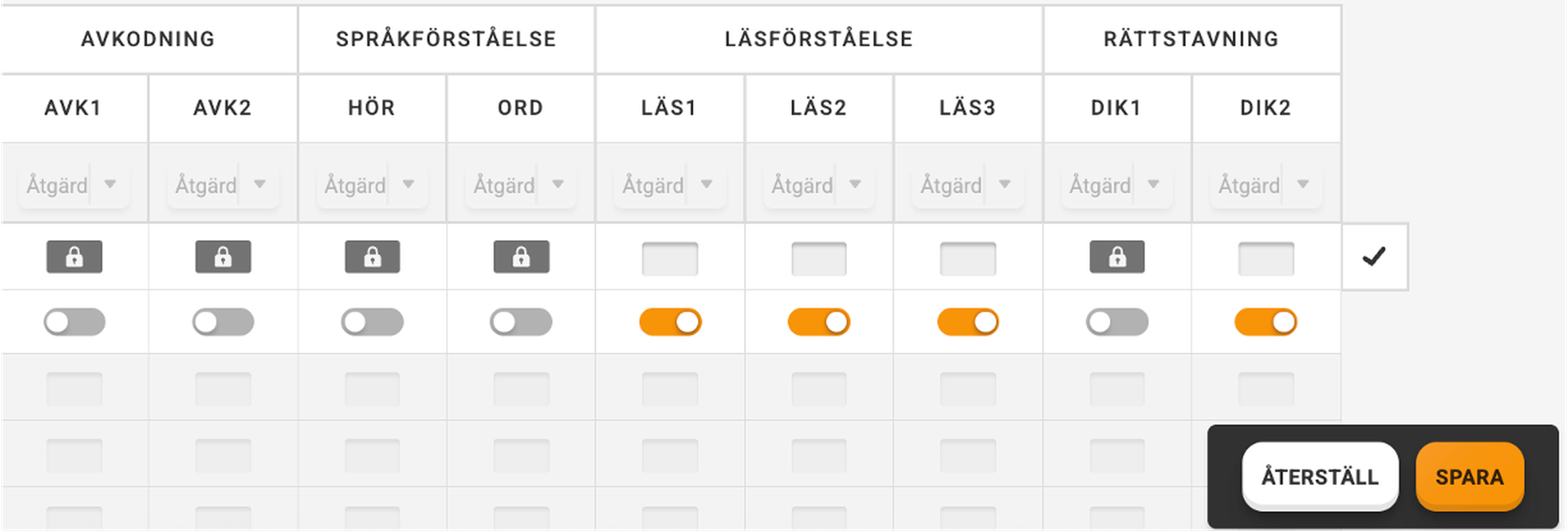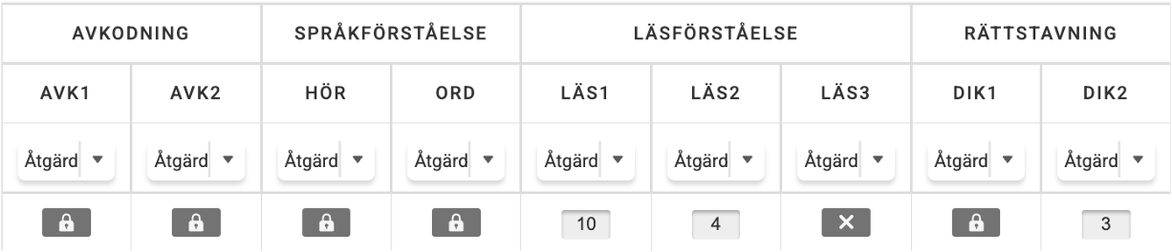 På lågstadiet stänger vi av tester automatiskt av två anledningar: När testerna är för lätta för eleven stängs de av och illustreras då med en bock (avstängt pga för lätt). När testerna är för svåra stänger vi också av dem och det illustreras då av ett kryss (avstängt pga för svårt).